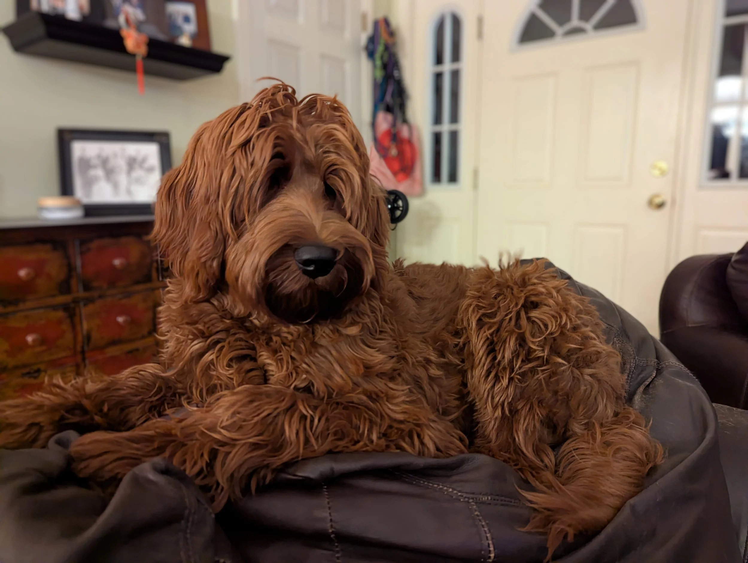 We are super excited to add Jasper to our breeding boys! Jasper is from our Gigi & George February 2025 litter! Jasper has to softest, most luxurious fleece coat we’ve ever felt! He has a beautiful red coat, strong black pigment and a tail that is constantly in motion! Jasper is super smart, affectionate and social. He does not know a stranger. Jasper lives with his wonder guardian family in Concord, MA where he is working towards his Canine Good Citizen certificate! We cannot wait to see the pups Jasper produces!